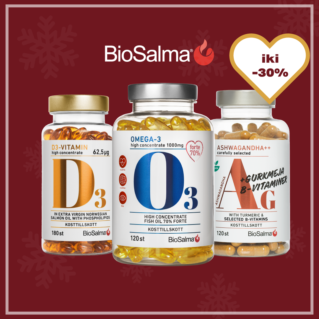 Omega-3 riebalų rūgštys yra būtinos širdies, smegenų ir imuniteto sveikatai, tačiau dauguma europiečių negauna jų pakankamai su maistu. Sužinokite, kaip atpažinti Omega-3 trūkumo požymius ir pasirinkti tinkamiausią BioSalma papildą: natūralų lašišų aliejų, koncentruotą forte, veganišką iš dumblių arba skanų Tutti Frutti vaikams.
