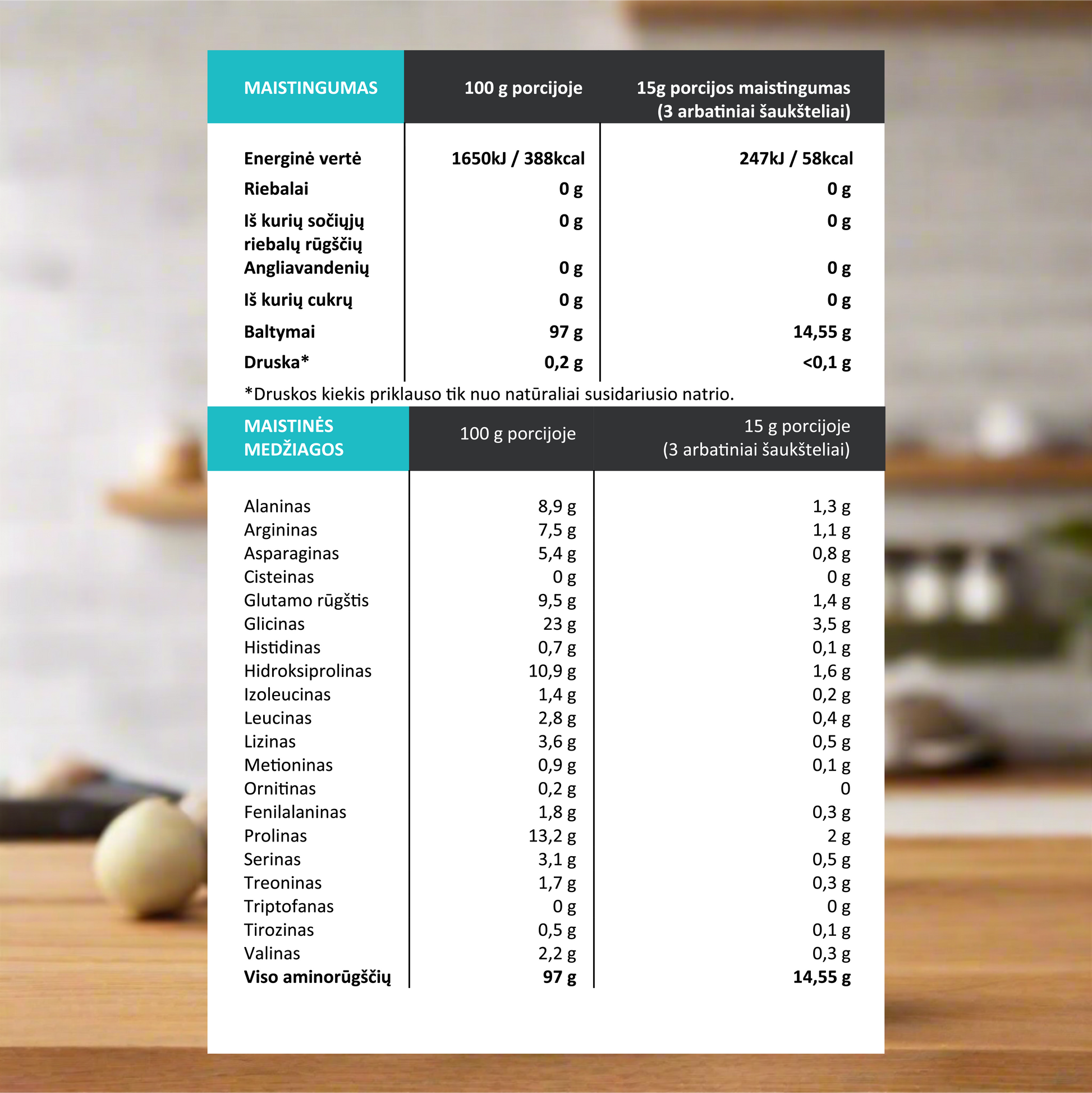 | Пищевая ценность в 100 г порции: энергетическая ценность 1650 кДж / 388 ккал, жиры 0 г, из которых насыщенные жирные кислоты 0 г, углеводы 0 г, из которых сахара 0 г, белки 97 г, соль* 0,2 г. | |||